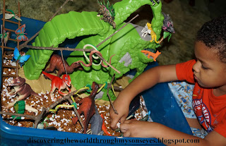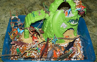 He spent a good while just playing with his dinosaurs, lizards, snakes, and he also had in a corner of the bin some cats, and doggies separated by a branch and fence to keep the dinosaurs away.