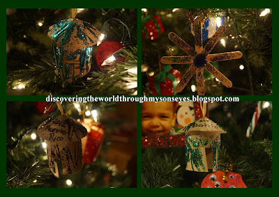 Our ornaments are piñatas in honor of my book review: A Piñata in a Pine Tree: A Latino Twelve Days of Christmas. For the ornaments we used rolls of paper towel, gift wrapping rolls, and of course toilet paper rolls. Colorful pieces of tissue paper, glue, ribbon, and candy!