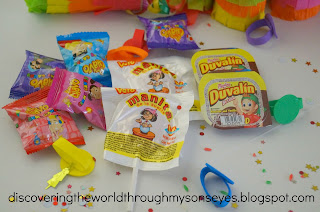 For the treats we made mini-piñatas filled with Mexican candy. We made them out of toilet paper rolls and wrapped with colorful party streamers, and ribbon to carry.